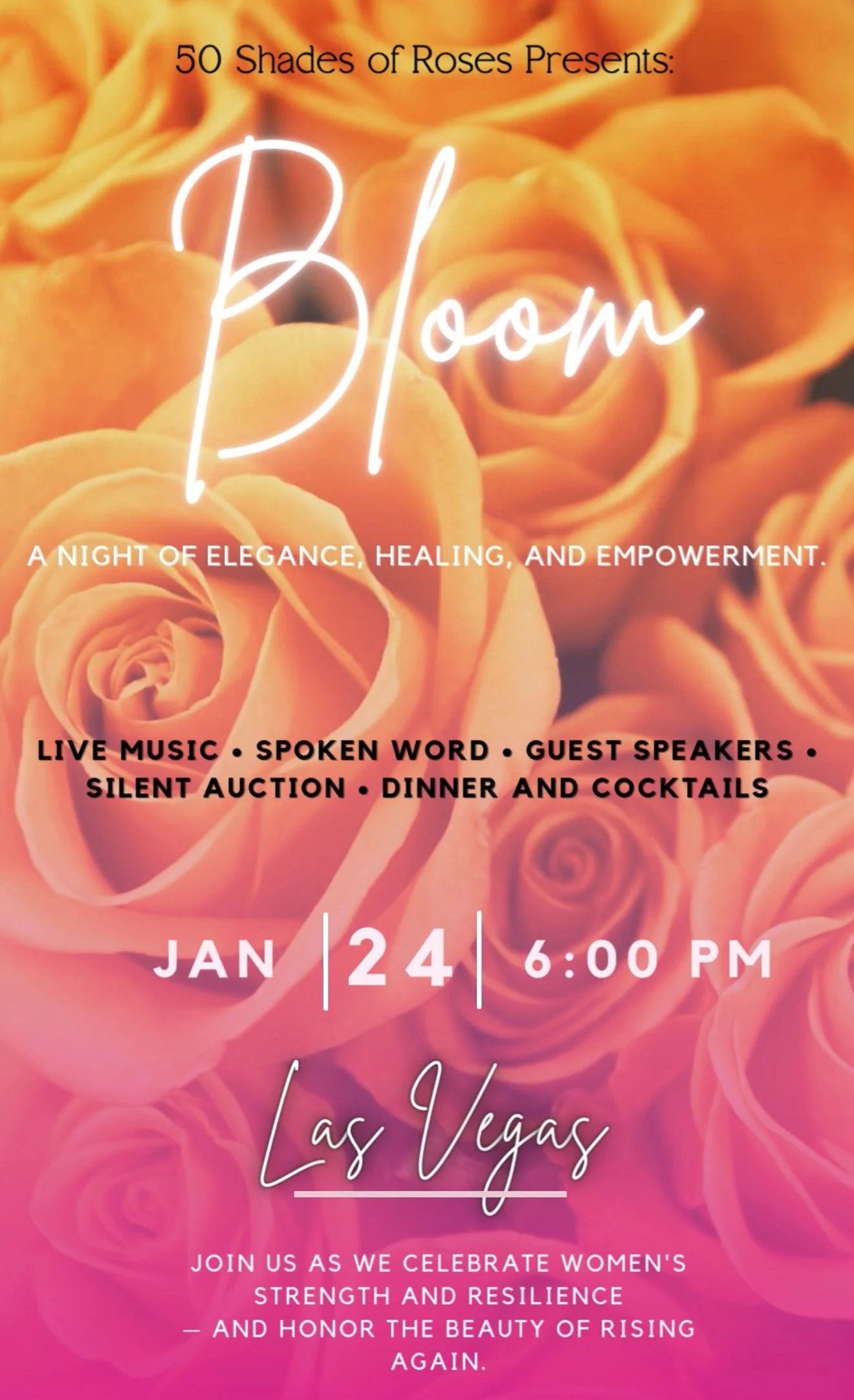 Bloom: An All White Affair is an elegant charity event celebrating resilience, renewal, and the power of womanhood. This evening will raise funds for 50 Shades of Roses, a nonprofit organization dedicated to supporting women affected by domestic abuse through healing programs, educatir y and creative empowerment initiatives.